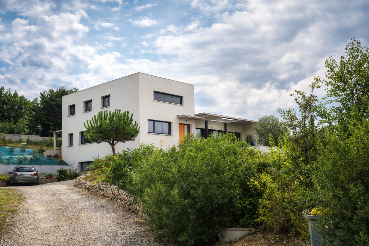 Cette maison présente une architecture contemporaine minimaliste, caractérisée par des volumes cubiques imbriqués et des toitures plates. Les façades, enduites de blanc, mettent en valeur la géométrie simple du bâtiment et renforcent son expression moderne.